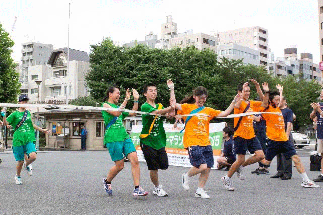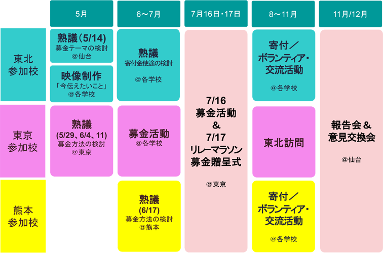 | ・実施内容: | ① 東北参加校による募金の使途を考える「熟議」/仙台 ② 東北参加校による映像撮影/東北 ③ 東京参加校による募金活動の方法を考える「熟議」/東京都内 ④ 東京・東北参加校による募金活動/東京都内 ⑤ チャリティリレーマラソン (都内約35km) ⑥ 東京参加校による被災地訪問ツアー ⑦ 東北参加校による募金使途の再考、寄付・ボランティア活動 ⑧ 寄付金使途報告会・意見交換会/仙台 |