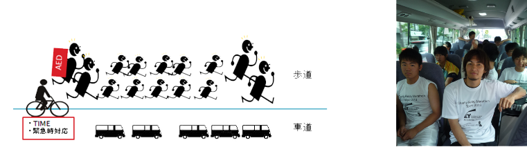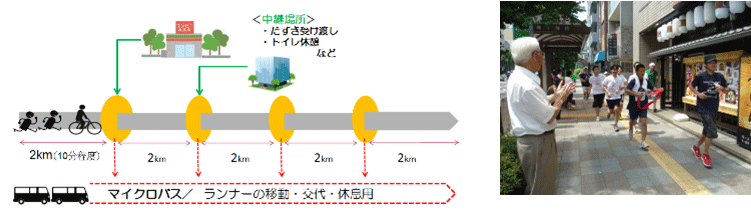 生徒10人程度、大人5人程度、自転車伴走をグループとし、時速8~10㎞ のランニングスピードで走行します。ランナー以外の移動はマイクロバスで行います。タスキ受け渡し地点で、バスから次に走る生徒は下車し、走り終わった生徒は乗車し、次の中継ポイントへ向かいます。