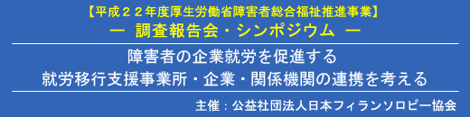 本年度、日本フィランソロピー協会では、平成22年度厚生労働省障害者総合福祉推進事業として、全国の就労移行支援事業所、障害者就業・生活支援センター、