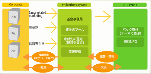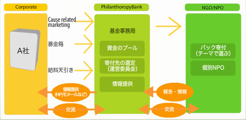 各企業・団体が単独で寄付する仕組みとしてご利用でき、寄付先、活動テーマを指定することも出来ます。また、この場合、○○会社フィランソロピーバンクバンク、○○団体フィランソロピーバンクバンクとして自社オリジナルの活動を付加することもできます。