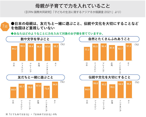 榊原 子どものQOLを年代ごとに測る指標があるのですが、幼稚園や保育園に比べて、小学生になると明らかに下がります。幼稚園や保育園では評価されずに、誰もがお山の大将で良かったわけですが、小学生になると、点数を付けざるを得なくなる。つまり評価が始まると、QOLが落ちて自己肯定感も落ちる。5歳と7歳の子どもについて、東南アジア4か国(中国、ベトナム、タイ、日本)で調査しましたが、どの国も同じ結果でした。