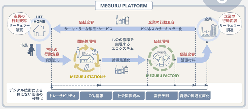 リニアモデルを見直し、成長エンジンをサーキュラーモデルに転換する必要がある。そのひとつが廃棄物の資源化です。家庭ごみを分別し持ち寄る、互助共助コミュニティ型の資源回収ステーション「MEGURU STATION®」や、回 収された資源をさらに質の高い循環資源に加工し、安定的に持続可能な調達を目指す企業に出荷する「MEGURU FACTORY」、そして、ひと・自然・もの・情報をつなげる「MEGURU PLATFORM」の構築による市場創出を進めます。いずれも、資源問題とともに、地域住民がつながり、孤独や少子高齢化といった社会課題の解決を目指して取り組んでいます。