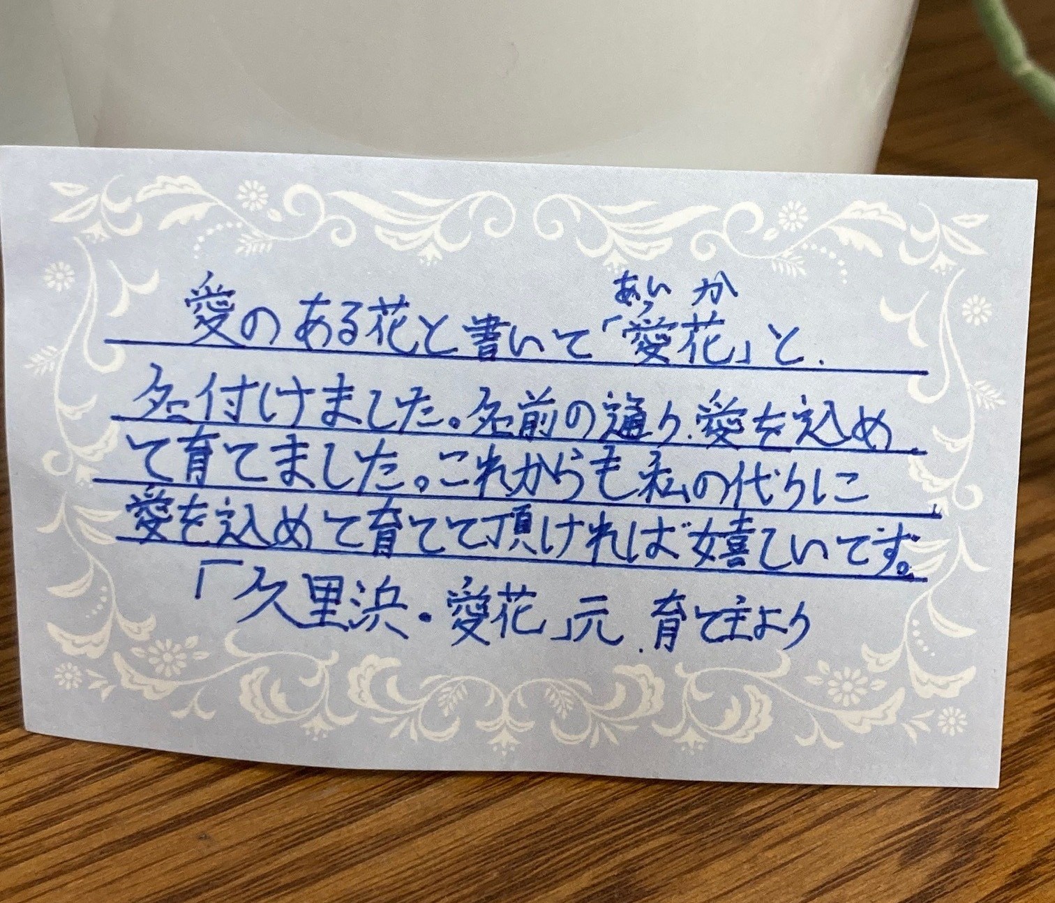 【写真右】胡蝶蘭に添えられた手書きのカード